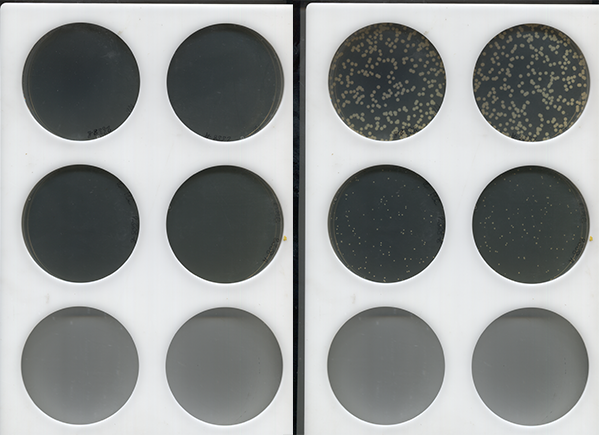 The image below shows the same set of plates at the start (left), and the end (right) of growth. The plates on the top row show good colony growth, while the plates on the middle row show inhibited growth.